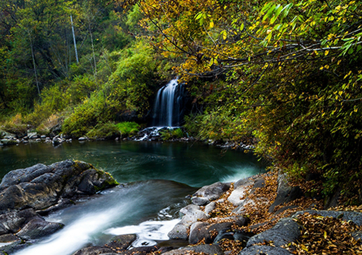 踏着豪爽瀑流的踪迹,沿着林间小道来到了峡谷,又是另一番景象,一幅“喷云吹雾花无数,峡谷藏幽景万千”的奇妙剪影展现在面前,漂泊的云雾缠绕林间,与我们结伴而行。百鸟婉转歌唱,河水因地而歌,那淙淙流水,有如松涛,有如竖琴,飞溅的水沫有如白絮银丝,铮铮叮咚之音,响彻峡谷之间。河水成潭处,湛蓝如碧,鱼游溪底,水平如镜。被秋霜染红的河谷两岸,真可谓“千朵万朵压枝低,满天锦绣连云开”,一团团,一簇簇,红遍峡谷,一望无际。走在红色的峡谷里,每一棵树都炫耀着自己的绚丽多姿,每一个枝叶都在微风中频频象人们点头致意。红红的叶子如同盛开的花辫,在阳光的照射下,流光闪烁,仿佛波浪在大海上翻腾。这时,微风四浮,那五颜六色的叶片伴随着飒飒的风声,如同天女撒花,飘向河面,拂起圈圈涟漪,散发着淡淡的清香,那碧绿的河流,如同一面绿锦缎,织满了五颜六色的花朵,随风抖动,五彩斑斓。那真是:河谷遍地都是花,花天花地涌花潮。