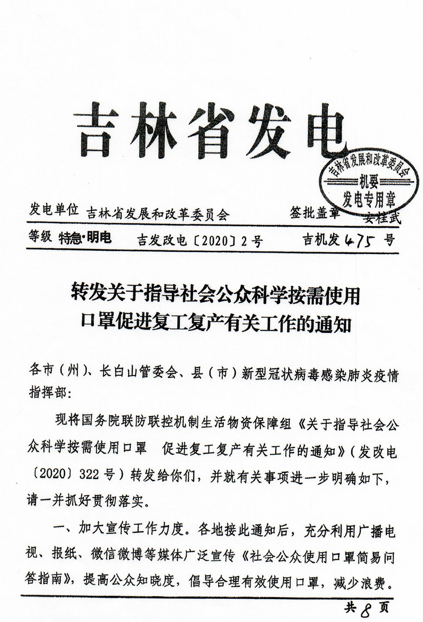 现将吉林省发展和改革委员会印发的《转发关于指导社会公众科学按需使用口罩促进复工复产有关工作的通知》(吉发改电〔2020〕2号)转发给你们,请认真抓好贯彻落实。