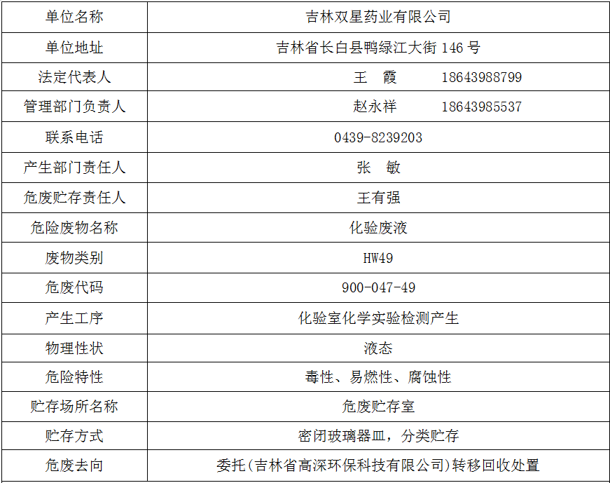吉林双星药业有限公司危险废物污染防治责任信息公示