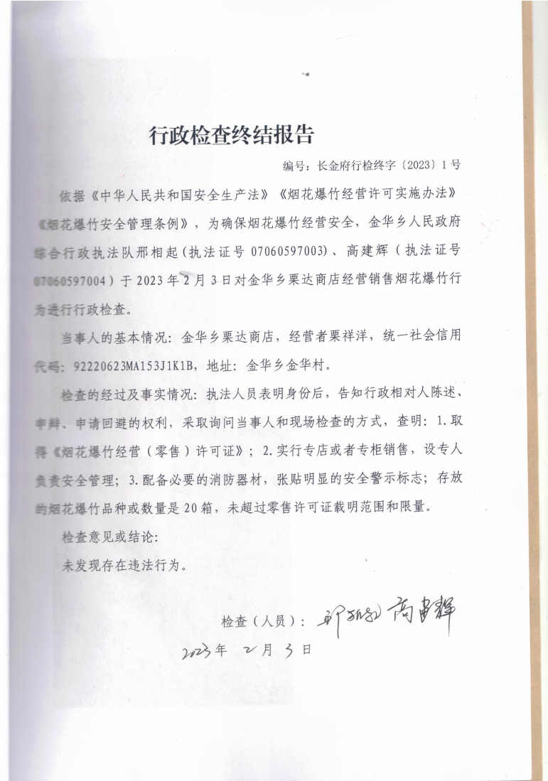 行政检查终结报告(长金府行检终字﹝2023﹞1号)