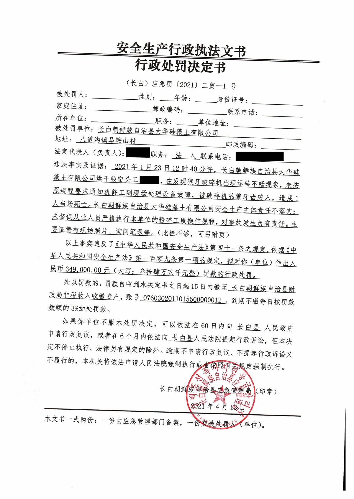 (长白)应急罚〔2021〕工贸—1号